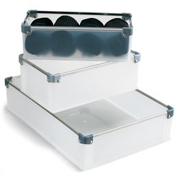Size - 9-1/8" x 5-5/8" x 3-1/2" h. Our Viola Drawer Organizers are an attractive way to establish order in dressers, armoires, bureaus, desks, and cabinets. They're extremely durable, made with metal reinforced corners and metal banding along the top, completely modular, and stack securely. Choose from three sizes to organize socks, undergarments and T-shirts office supplies and cosmetics and toiletries.||Modular, stackable | Polypropylene plastic | Metal reinforced corners and edgebanding | Three sizes for organizing clothing, accessories, office supplies, arts & crafts essentials, cosmetics and toiletries
